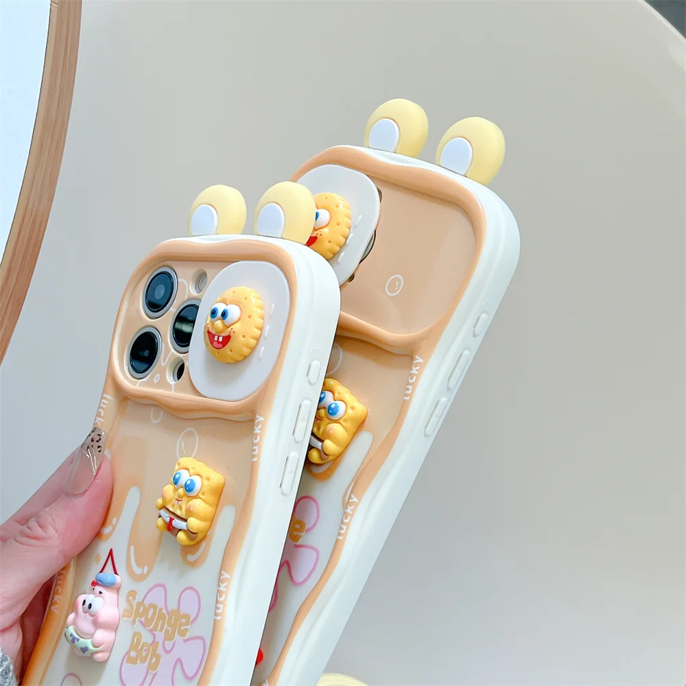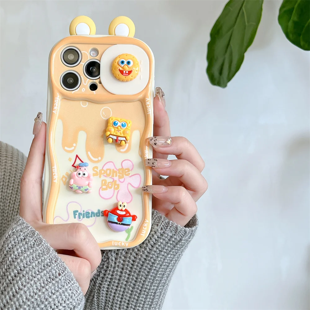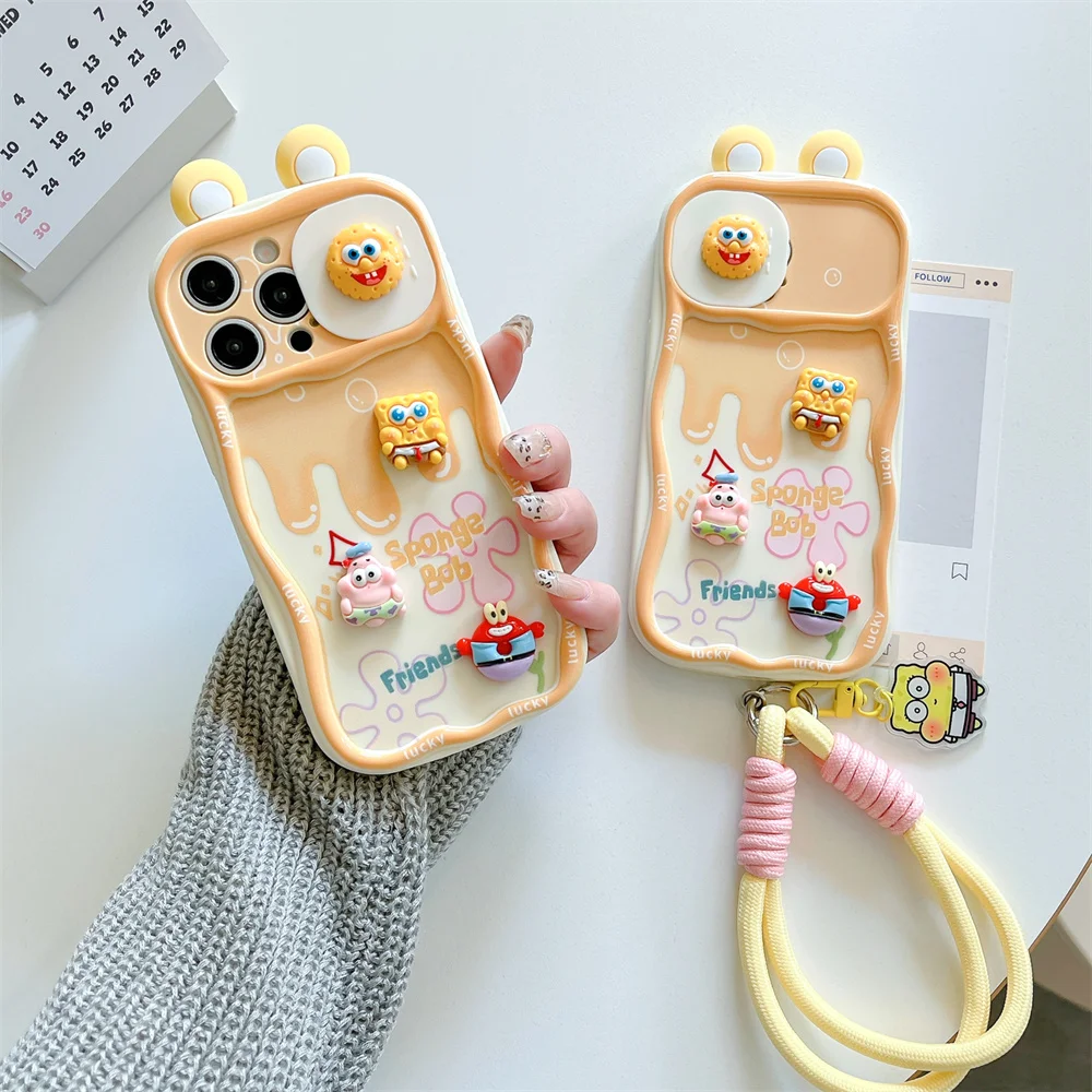 3D Cartoon SpongeBob Patrick Star Push-Pull Camera Phone Case for iPhone 16, 15, 14 Plus, 13, 12 Pro Max, 11 – With Wrist Strap Cover