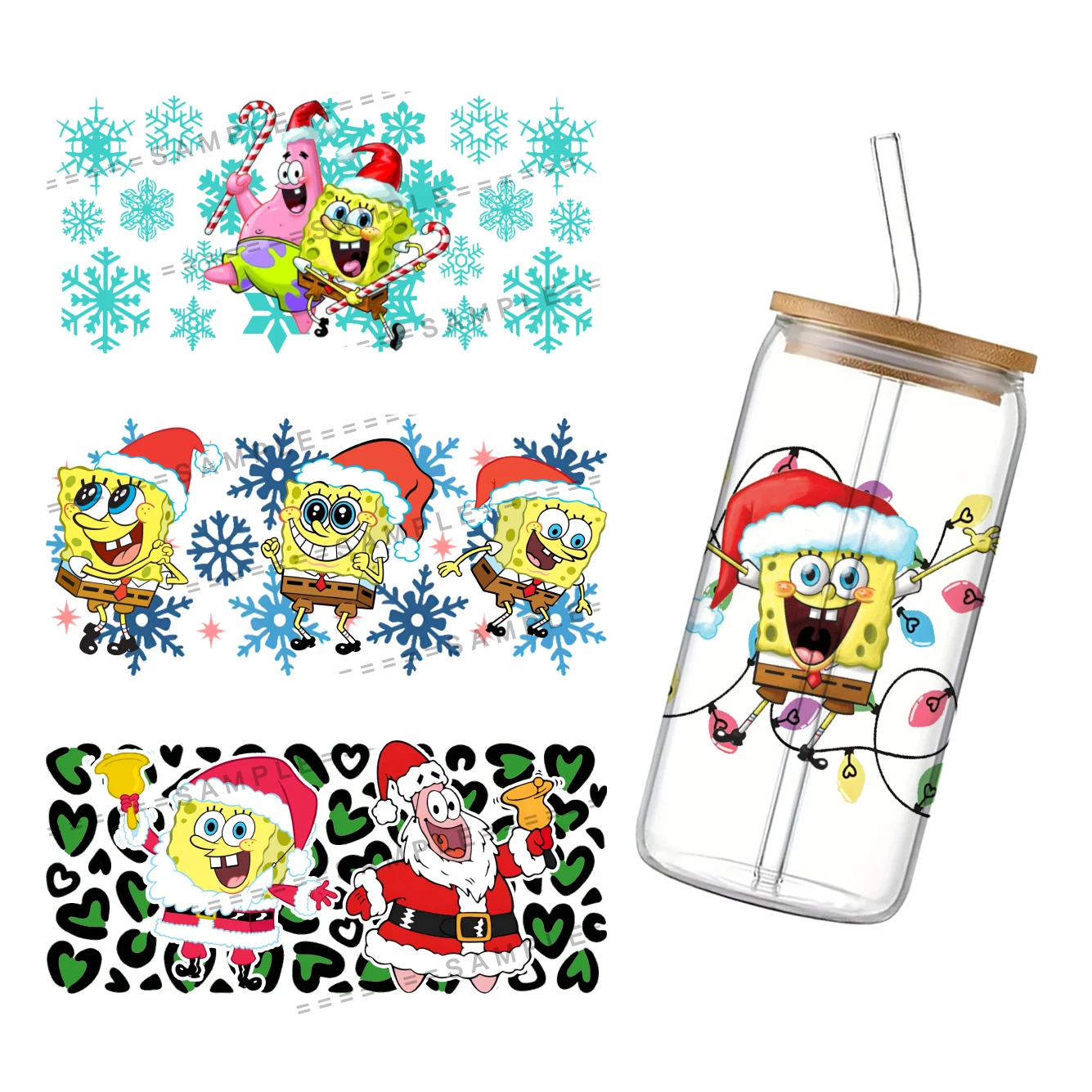 🎄 Christmas SpongeBob & Patrick Star UV DTF Transfer Sticker – Waterproof Decal Wrap for 16oz Glass Cups 🧽🎁🍹