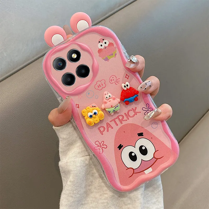 📱 New 3D Cute Ear Cartoon SpongeBob & Patrick Star Phone Case for Honor X8A, X8B, X5 Plus, X9C – Smart Toy Wrist Strap Lanyard Cover 🎉🐢